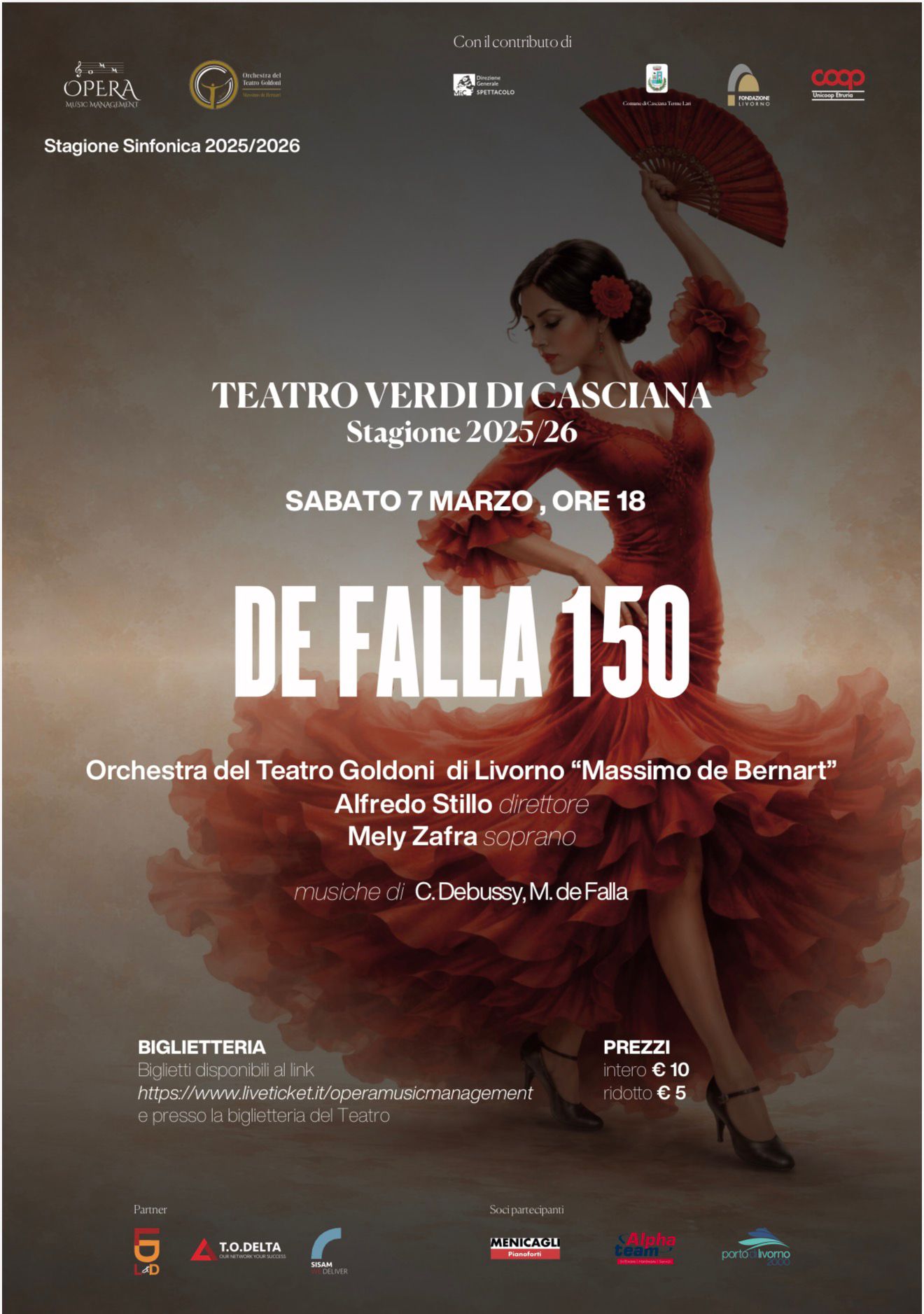 Un concerto all'insegna della musica spagnola per celebrare il più celebre compositore della scuola impressionista spagnola, l'Orchestra del Teatro Goldoni, guidata dal giovane talento Alfredo Stillo darà vita a meravigliose melodie lusitane con il supporto del Soprano spagnolo Mely Zafra
